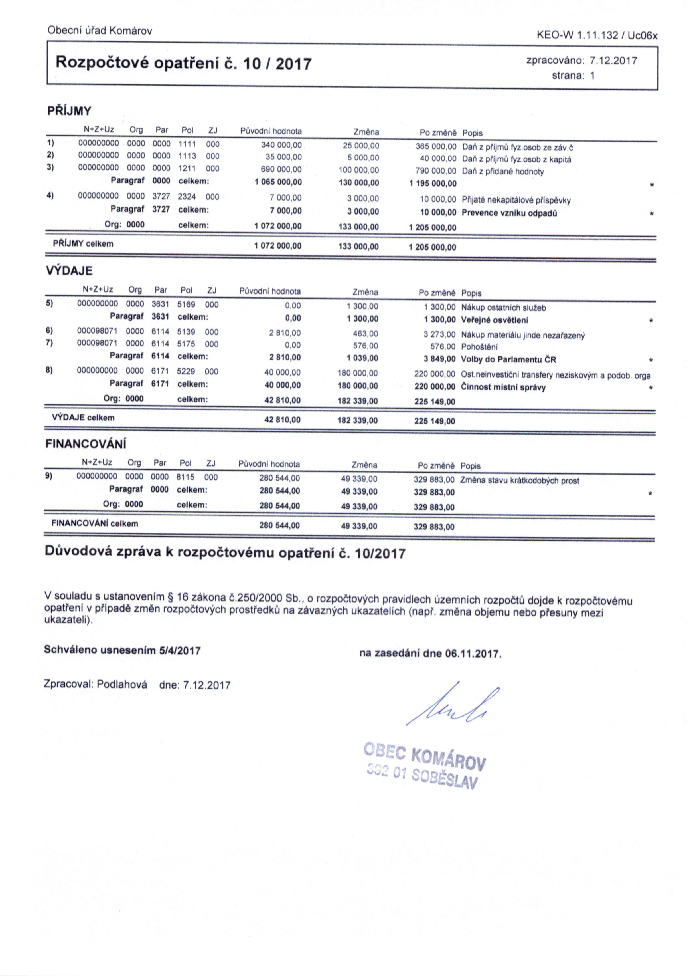 Rozpočtové opatření č. 10/2017