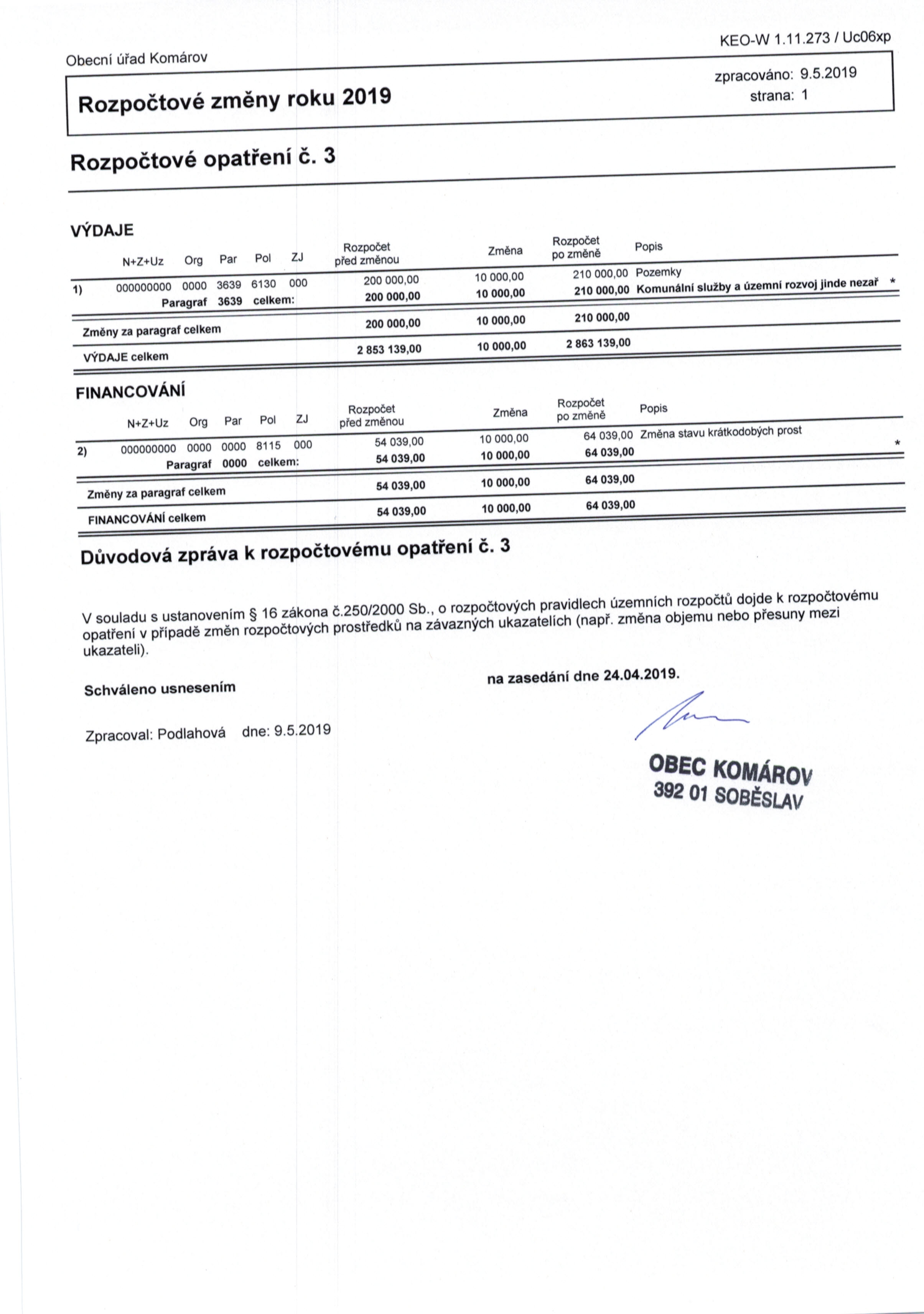 Rozpočtové opatření č. 3/2019