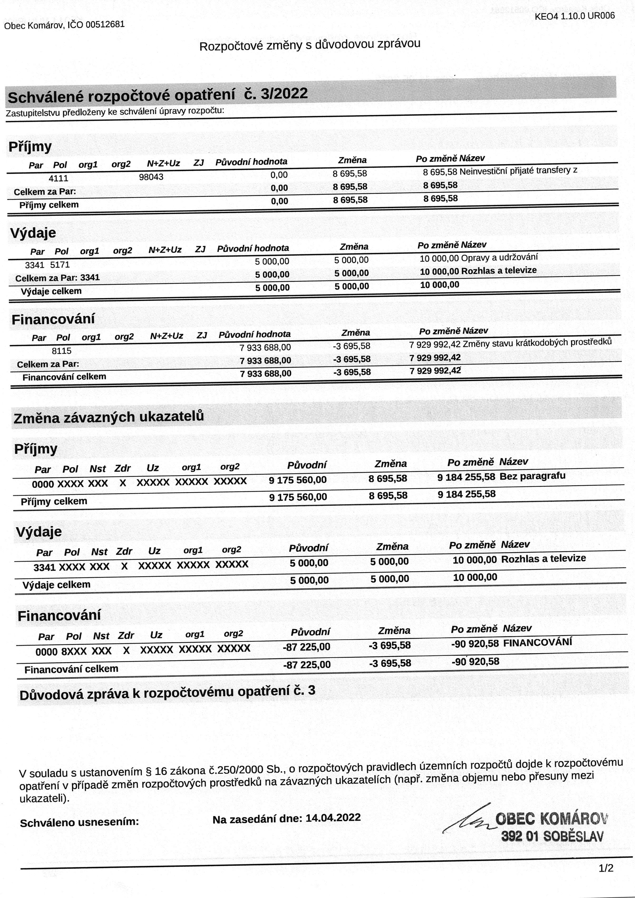 Rozpočtové opatření č. 3/2022