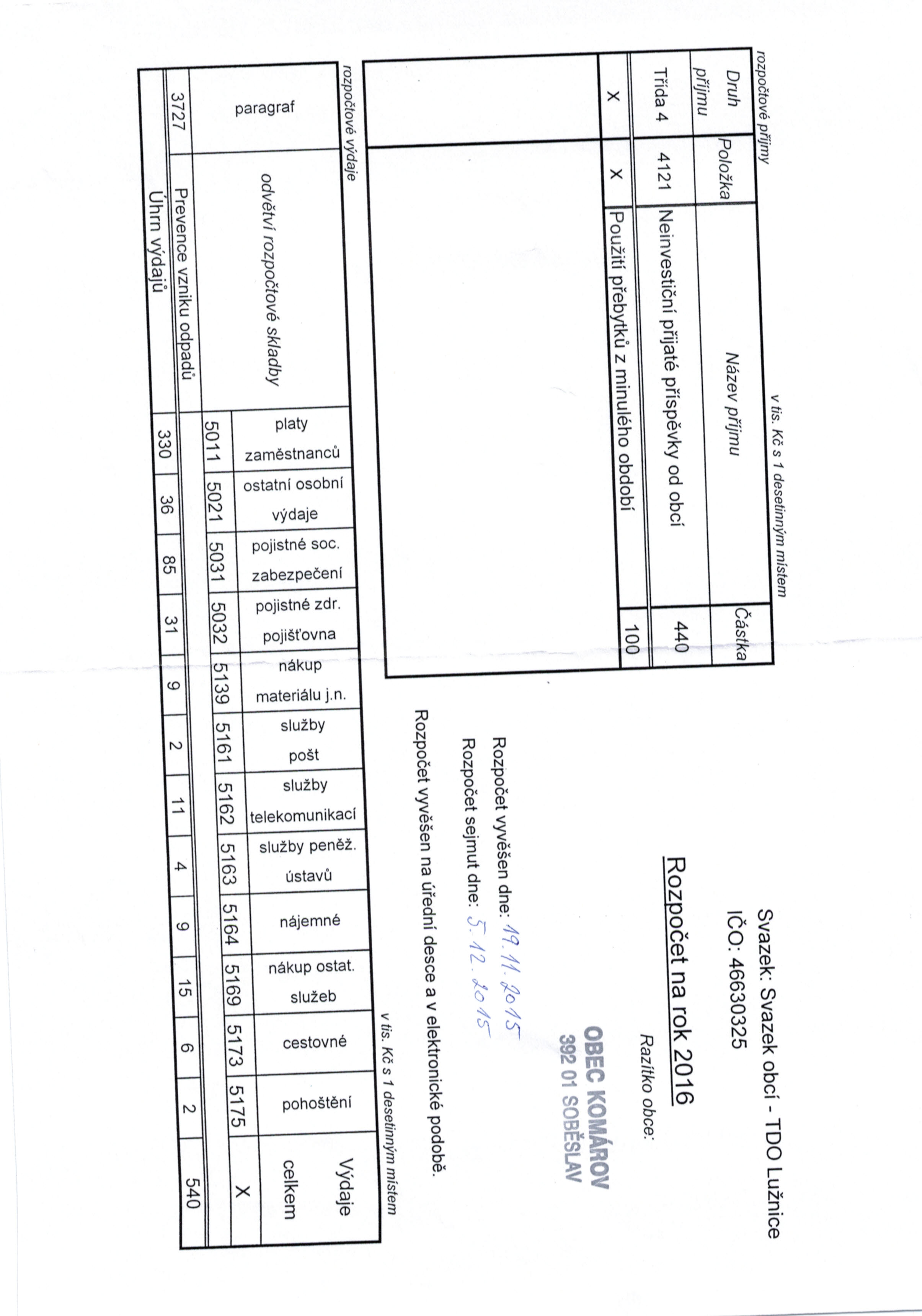 Rozpočet TDO Lužnice na rok 2016