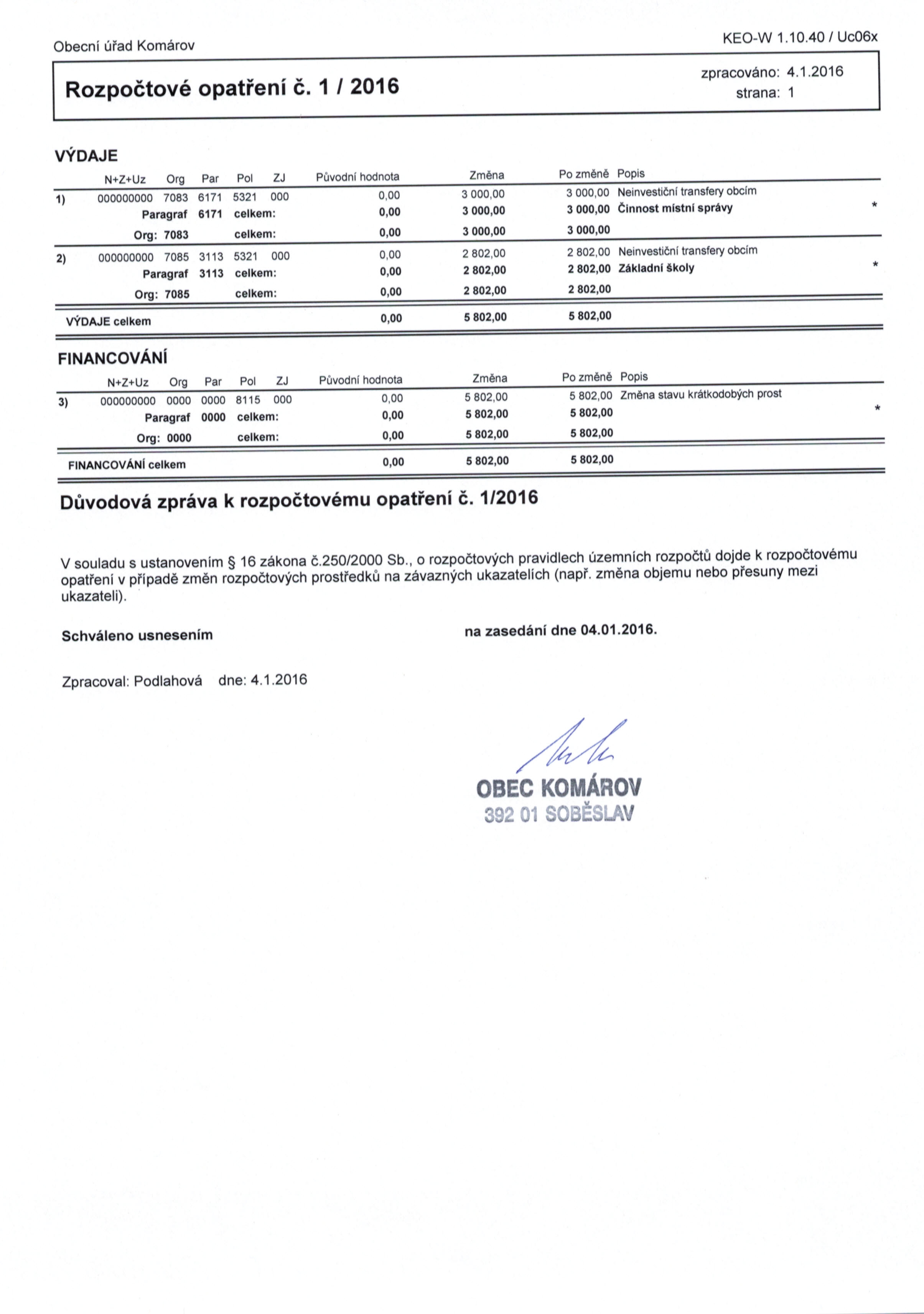 Rozpočtové opatření č. 1/2016