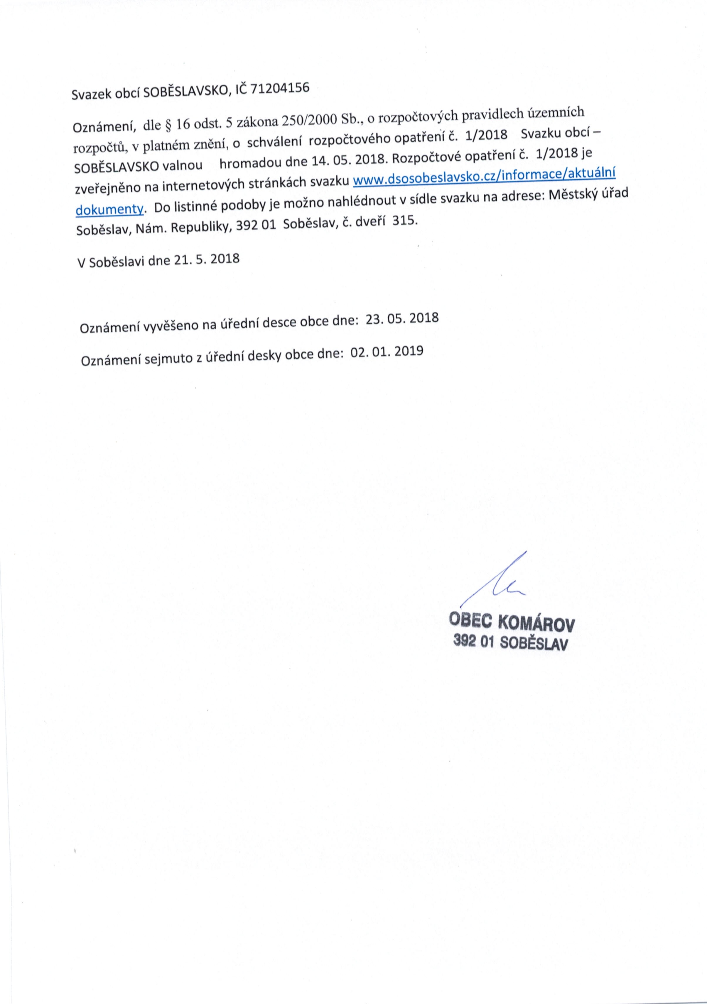 Rozpočtové opatření č. 1/2018 DSO Soběslavsko