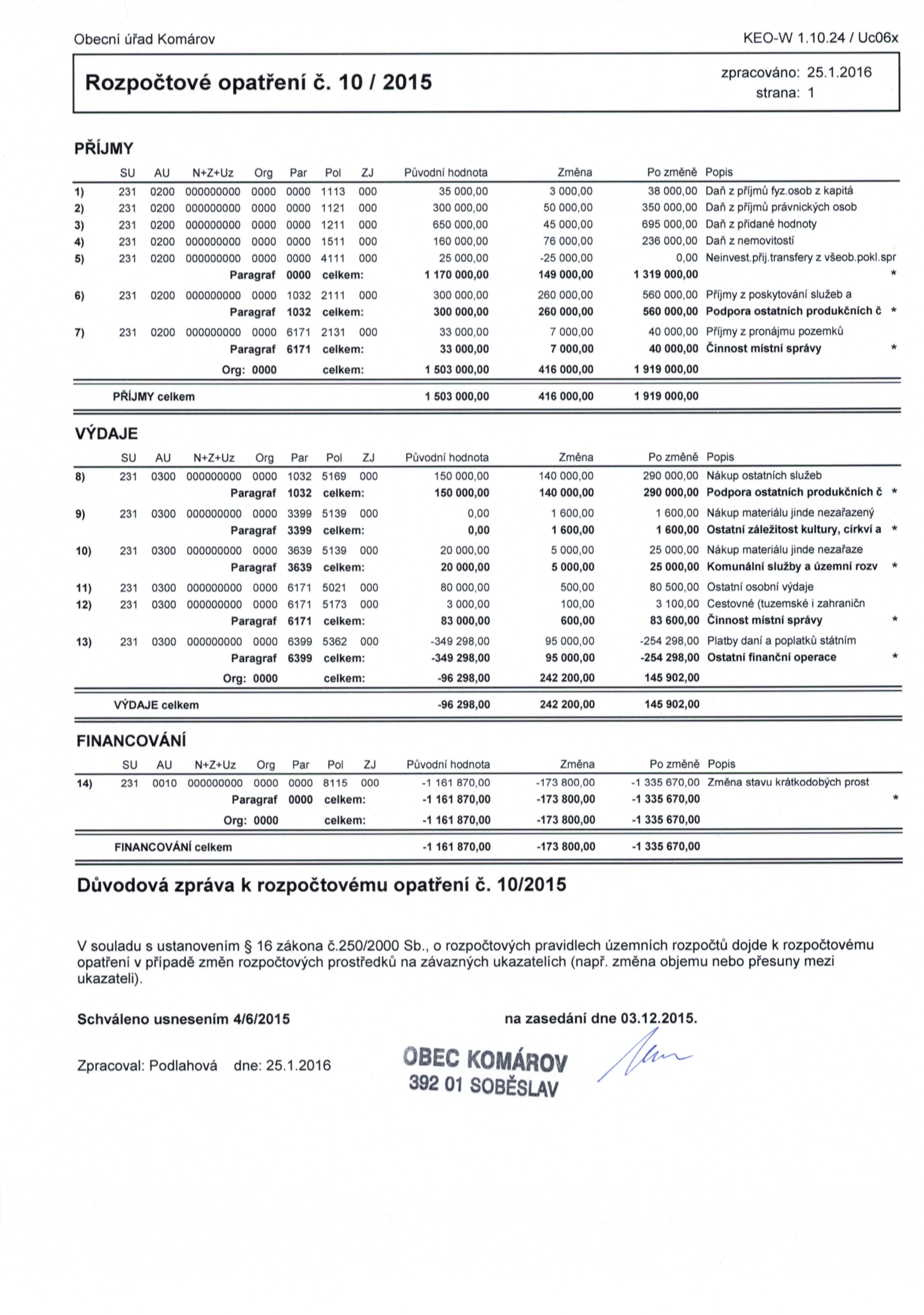 Rozpočtové opatření č. 10/2015