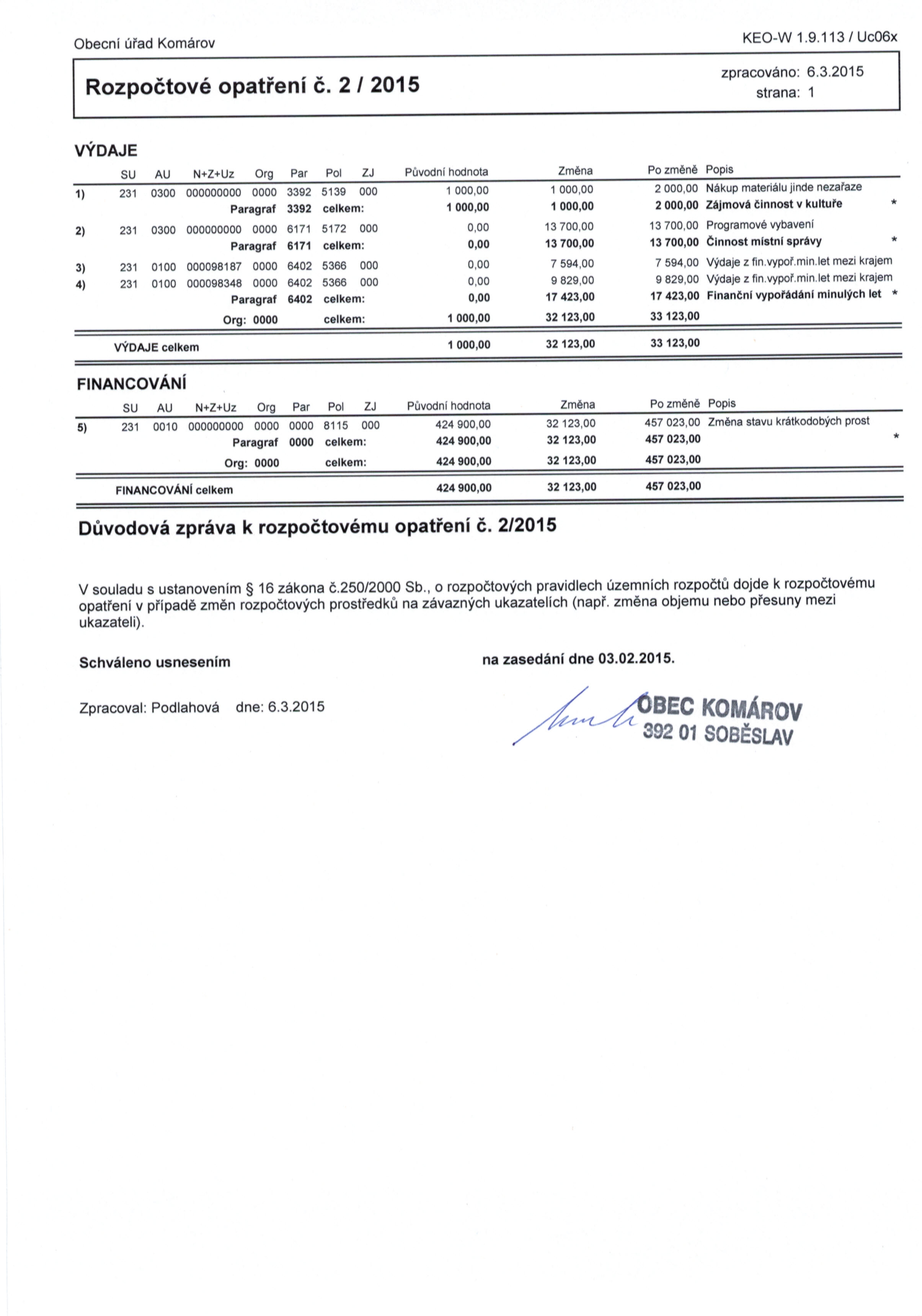 Rozpočtové opatření č. 2/2015