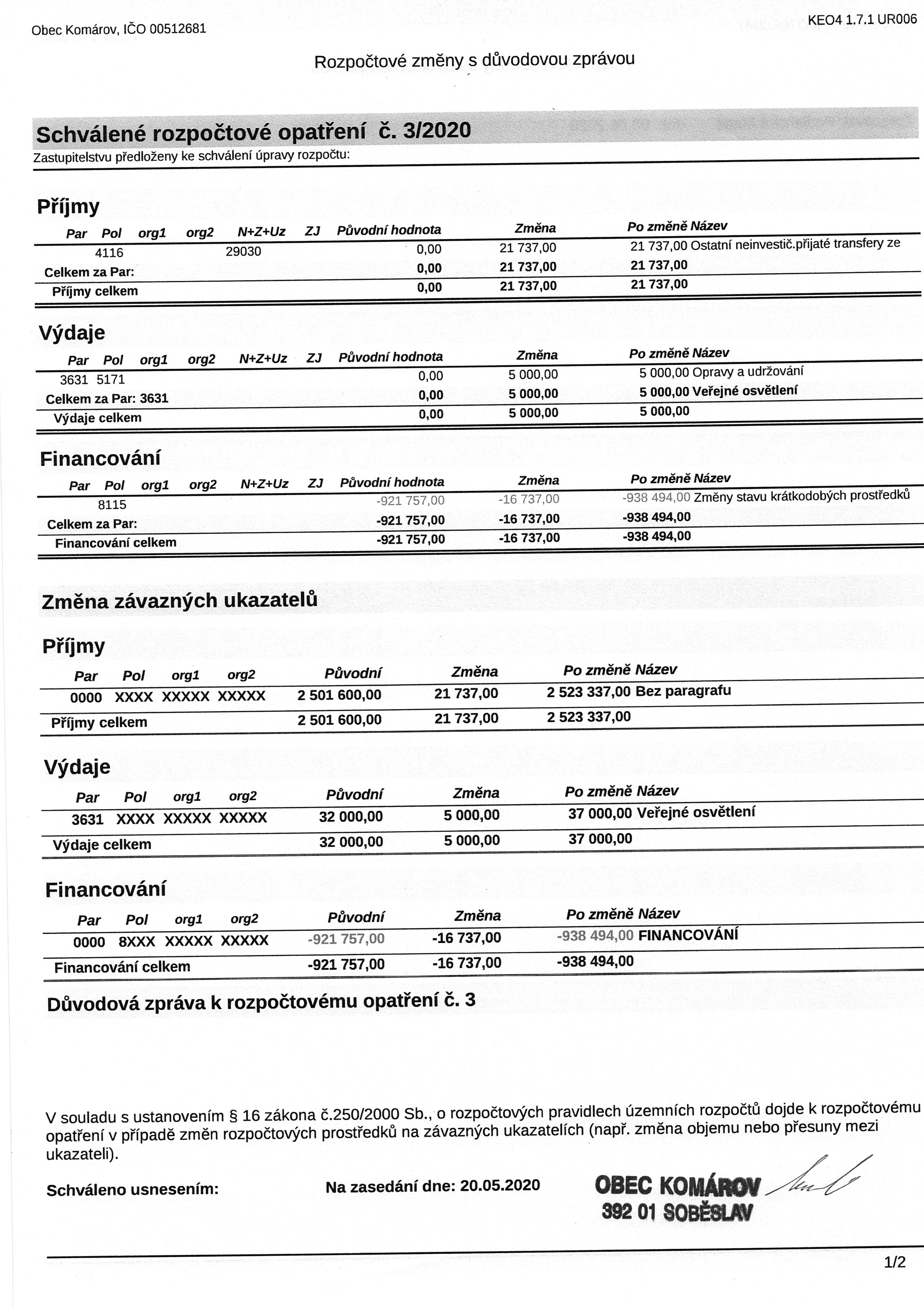 Rozpočtové opatření č. 3/2020.