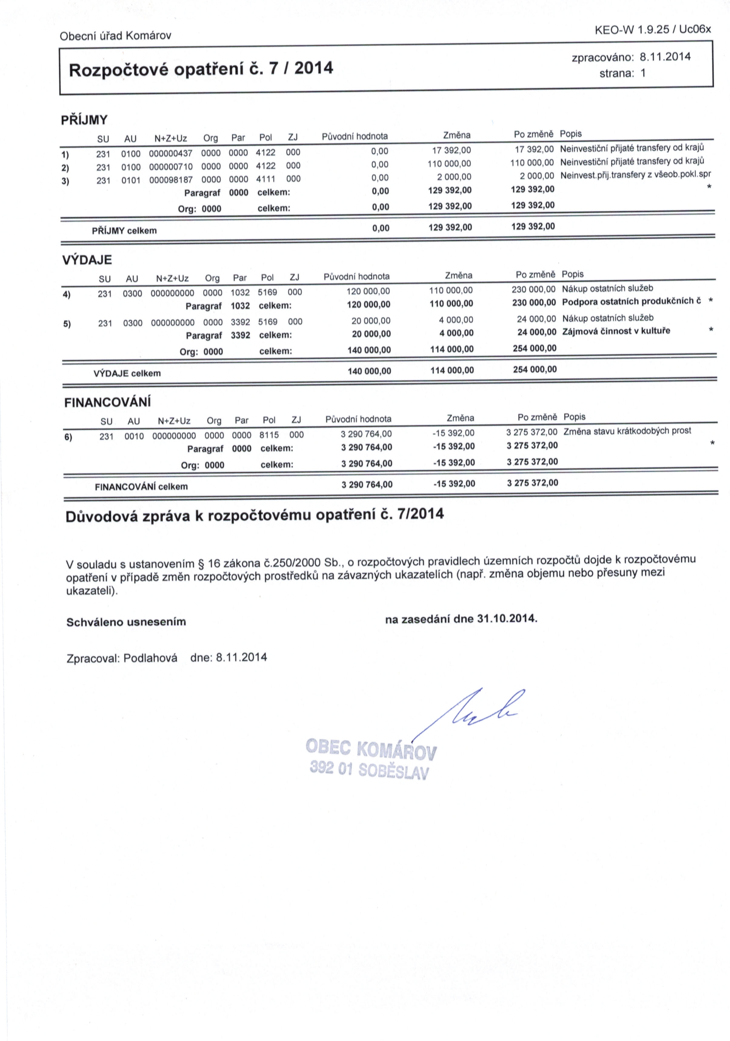 Rozpočtové opatření č. 7 - výkaz 2014