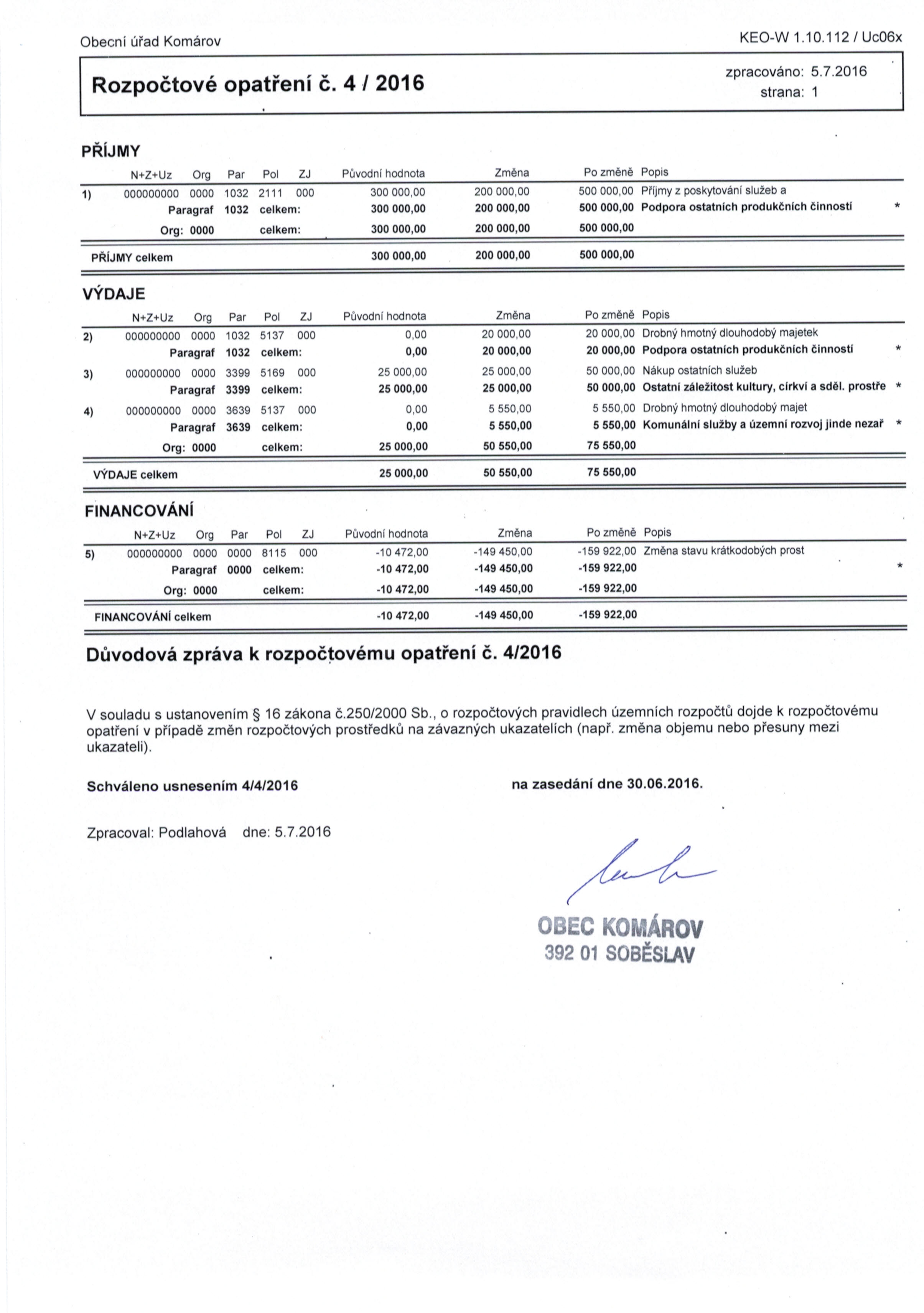 Rozppčtové opatření č. 4/2016