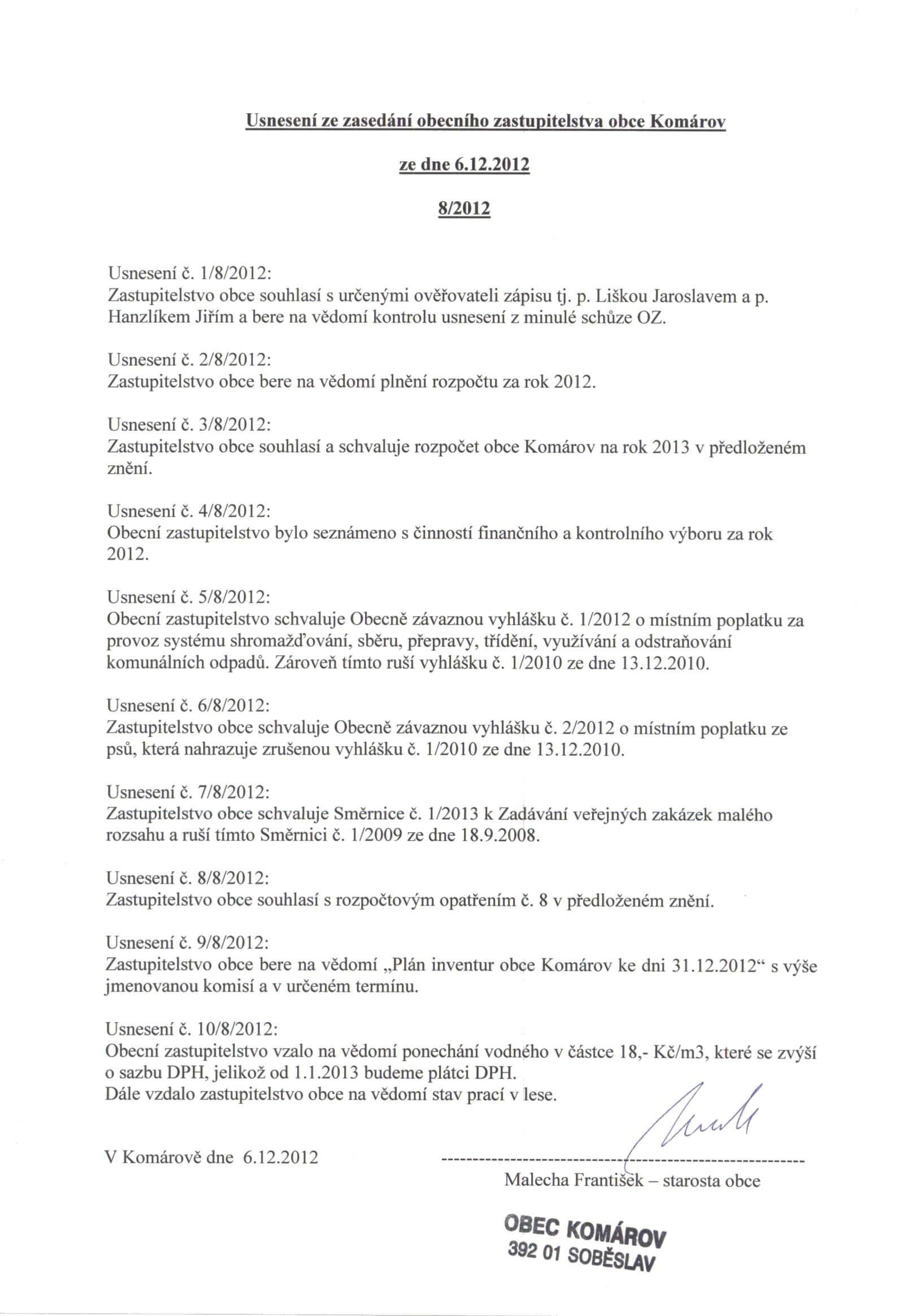 Usnesení zastupitelstva č. 8/2012